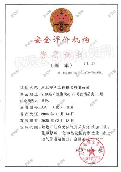 公司具有河北省應急管理廳頒發(fā)的安全評價機構(gòu)資質(zhì)證書,可在全國范圍內(nèi)從事陸地石油和天然氣開采業(yè);石油加工業(yè),化學原料、化學品及醫(yī)藥制造業(yè);陸上油氣管道運輸業(yè)、金屬冶煉等多種類型企業(yè)的安全評價。
