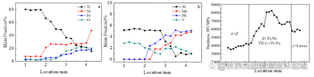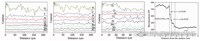 △成分變化以及顯微硬度變化(a、b、c 依次為底→頂三個(gè)結(jié)合區(qū)域的元素變化)