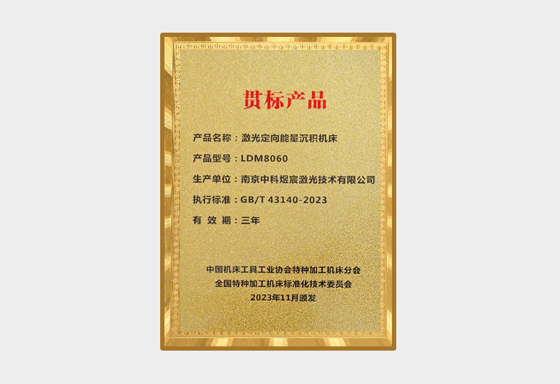 11月16日,中國機床工具工業(yè)協(xié)會特種加工機床分會2023年會員大會在成都成功舉辦。會議頒布了2023年度“貫標產(chǎn)品”名錄。南京中科煜宸激光技術(shù)有限公司的激光定向能量沉積機床-LDM8060憑借所有檢測指標均滿足國標《GB/T4310-2023激光定向能量沉積機床通用技術(shù)規(guī)范》的要求,榮獲了“貫標產(chǎn)品”的榮譽
