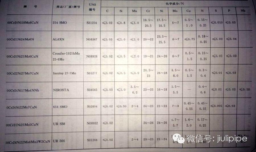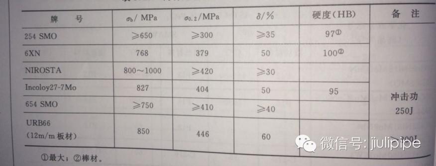 表1.超級奧氏體不銹鋼的牌號和化學成分