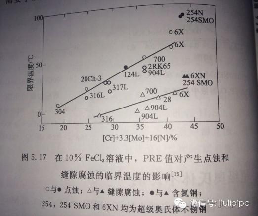 圖2.在10%FeCl3溶液中,PRE值對產(chǎn)生點蝕和縫隙腐蝕的臨界溫度的陰影