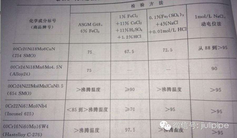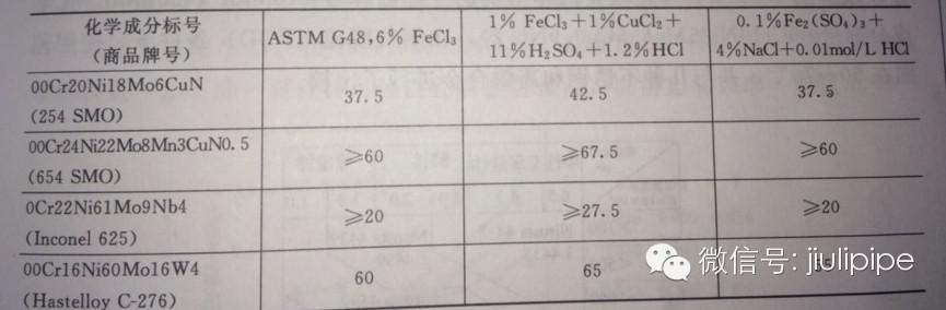 表4-6系在一些試驗條件下,幾種超級奧氏體不銹鋼與知名高鎳(鎳基)耐蝕合金Inconel625(0Cr22Ni61Mo9Nb4)和HastelloyC-276(00Cr16Ni60Mo16W4)耐點蝕、耐縫隙腐蝕性能的比較。