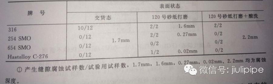 表7.在天然海水中,不同表面狀態(tài)的縫隙腐蝕試驗結果