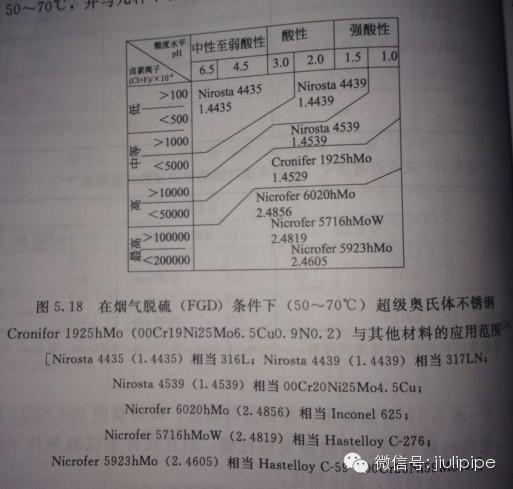 圖9.在煙氣脫硫(FGD)條件下,使用范圍在50~70℃,超級奧氏體不銹鋼(德國牌號Cronifor 化學成分標號 00Cr19Ni25Mo6.5Cu0.9N0.2),與幾種不銹鋼和高鎳合金比較。