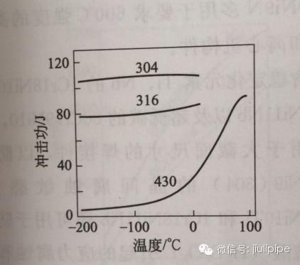 圖2.不同溫度下,Cr17(430)18-8(304)、18-12-2(316)不銹鋼的韌性變化