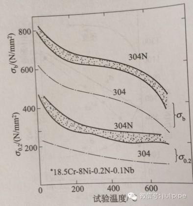 含氮牌號0CrNi9N和00Cr19Ni10N,主要是由于氮的固溶強化,提高了0CrNi9N和00Cr19Ni10N的強度(圖5),但并不顯著降低鋼的塑、韌性。同時鋼的耐蝕性也有進一步改善。含氮的0CrNi9N多用于要求600℃強度的高壓容器和離心機構(gòu)件。