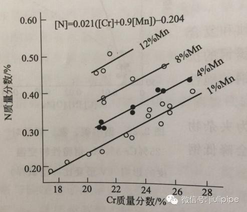 圖1.含14%Ni 且不同鉻、錳量的不銹鋼,氮在鋼中的溶解度