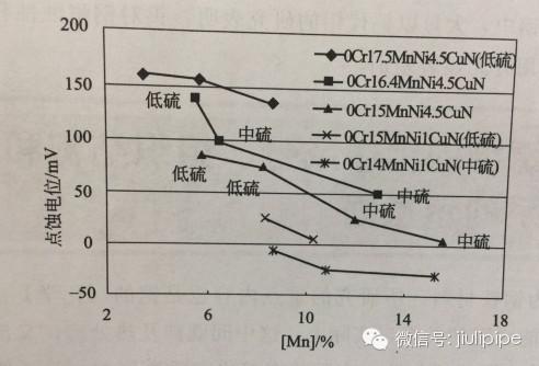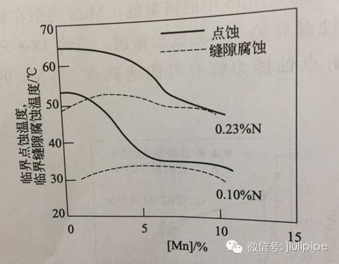圖2.錳對Cr-Ni奧氏體不銹鋼耐點蝕性的影響
