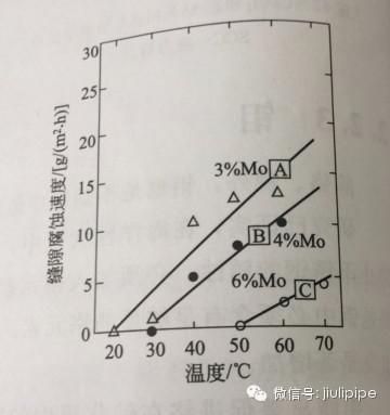 鉬在不銹鋼中,能提高鋼的再鈍化能力,其耐點(diǎn)蝕和縫隙腐蝕的能力約為鉻的3倍,為了耐點(diǎn)蝕和耐縫隙腐蝕,不銹鋼中一般還需加入鉬。鉬還對(duì)防止以點(diǎn)蝕為起源的應(yīng)力腐蝕有利。鉬在不銹鋼耐點(diǎn)蝕和耐縫隙腐蝕性能的影響分別見(jiàn)圖2和3。