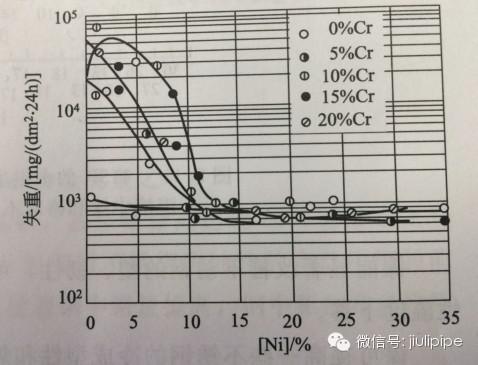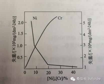 圖1.鋼中鉻和鎳對耐稀硫酸的影響(10% H2SO4室溫下)