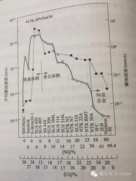 鎳與鉻組合能顯著提高奧氏體不銹鋼在苛性介質(zhì)(例如NaOH)中的耐蝕性(圖3),鎳還提高18-8不銹鋼耐氯化物應(yīng)力腐蝕的性能(圖4)。雖然在耐點蝕、耐縫隙腐蝕的PRE值(Cr+3.3Mo+16N,此值越大,耐點蝕、耐縫隙腐蝕性能越強)中并沒有鎳的作用在內(nèi),但在低鉻、鉬的通用鉻鎳奧氏體不銹鋼中,鎳的作用還是有益的(見圖5)。